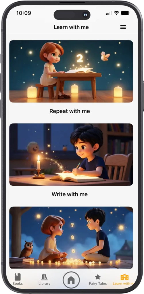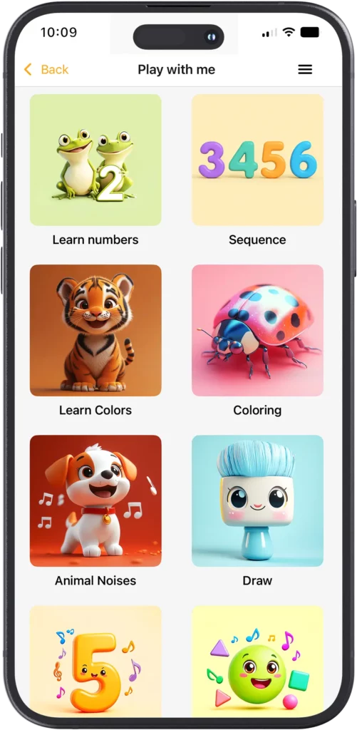 Learning has never been so fun! In the “Learn with Me” section, children can develop their logic, memory, and creativity through interactive games, exercises, and challenges. From letters and numbers to drawing and writing—learning here is a real adventure!