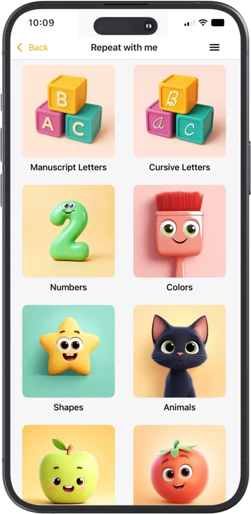 You learn best when you hear and repeat! In this game, the child will see pictures of numbers, letters, and words from various categories—animals, fruits, vegetables, emotions, and many more. With a single touch, they will hear the correct pronunciation and easily remember the new words!